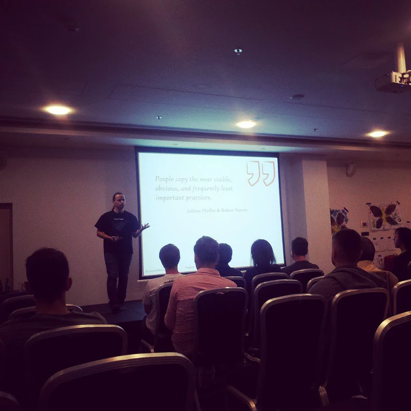 Stephen Parry rappelle l’importance de tout challenger, c’est à dire tout remettre en question. Je pense que c’est le plus important des messages qu’il a voulu faire passer lors de sa keynote et il me l’a confirmé dans les couloirs ensuite. On pourra aussi s’amuser à reprendre son expression “dans la plupart des organisation ce n’est pas vraiment du command & control, mais plutôt du command & hope”. Je note enfin son utilisation des concepts de emotional debt (dette émotionnelle) à comparer à la dette technique, et de authenticity gap, le (petit) mensonge entre ce que l’on sait être la vérité et ce que l’on dit être la vérité.