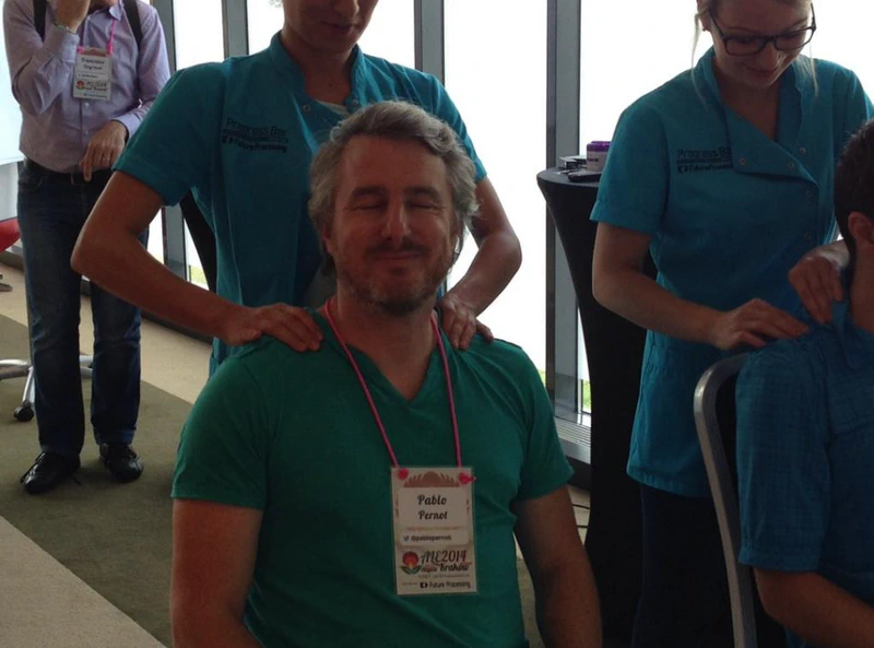 - ils ont amenés leurs masseuses (oui oui les masseuses qui bossent chez eux à plein temps pour les équipes, si si) et nous en avons tous profités au moins deux fois. Et pas des petits massages à la vite, des vrais moments de détente. TOP. Mais Future processing nous a aussi offert un super fête : location du bar, de la nourriture, et des vouchers pour des boissons, le tout agrémenté par quatre heures de bowling pour qui le souhaitait. Juste TOP. Enfin, alors que je vous parle je vais recharger mon téléphone avec la batterie qu’ils ont offert à chaque participant. Je n’ai pas hésité à discuter avec eux de leurs prestations (développement, expertise, offshore en mode agile = c’est à dire engagement de moyen !), et j’espère travailler avec eux très prochainement.